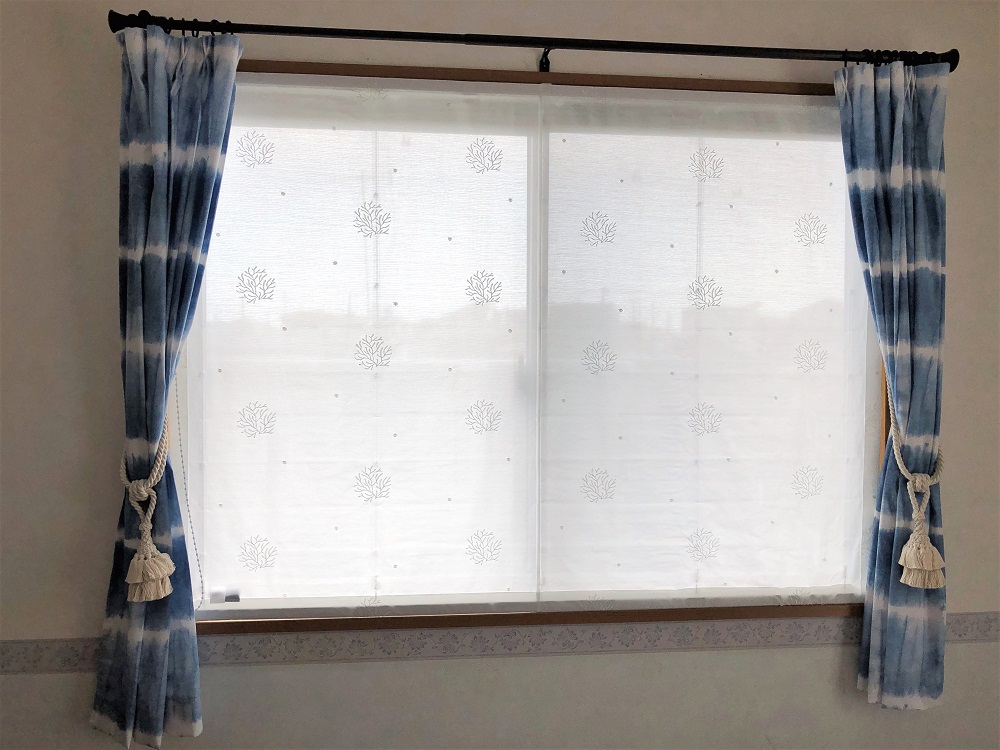 レース地にサンゴの柄が浮き出てかわいいです。腰窓にはシェードを使用。柄がパキッと浮き出て言うこと無し!に可愛いです。