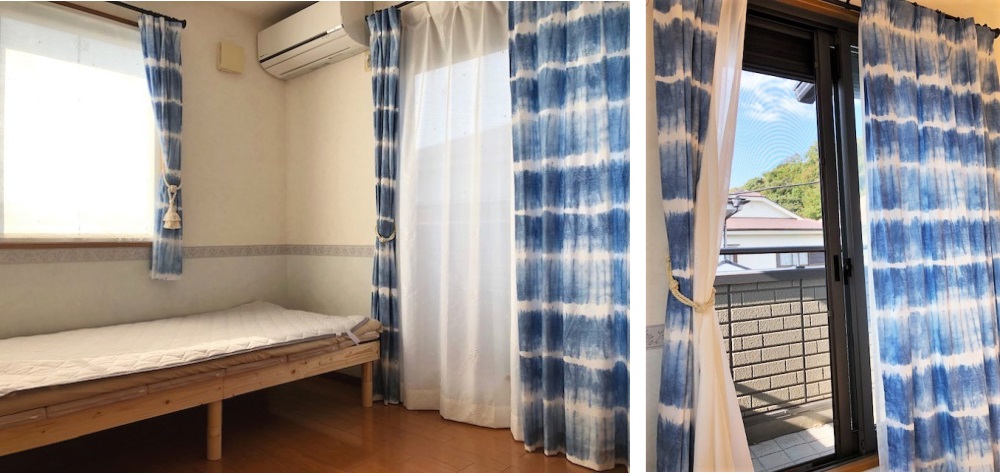 こちらの部屋は壁紙半分下が淡いブルーでシェルデザインのラインが入っていたので、海をイメージしてこちらのカーテンを選びました。