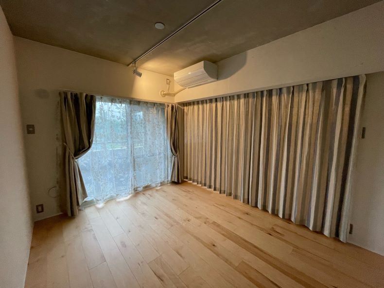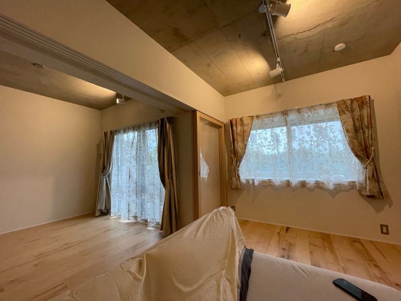 コンクリートと木目を基調としたオシャレな空間に、上品でかわいらしさも兼ね備えるレースと厚地カーテンが
