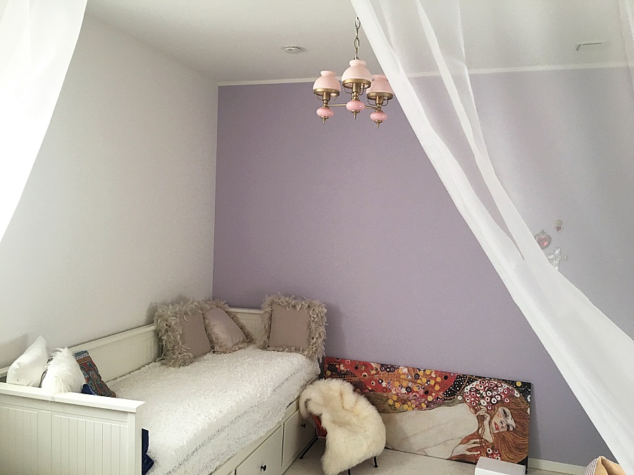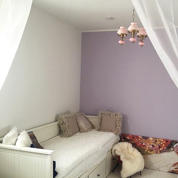 パープルのアクセントクロスやクッション、ソファー、横たわっている絵まで、相当なこだわりとセンスを感じます…!