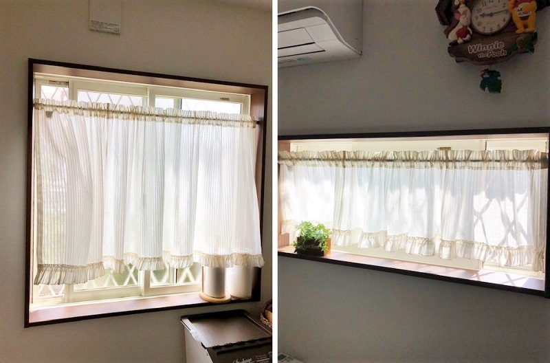 右側の写真は事務所として使っている小窓のカーテンです。丈もちょうど良く、幅もフリルが充分出ていて可愛いです♪