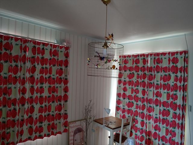 苺のカーテンは、とても可愛く地味だった部屋が、明るくポップな感じになりました。