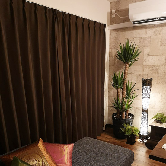 今回の引っ越しでリビングをアジアンの雰囲気を大事にしたかったので無地のブラウン系のカーテンを探していました。