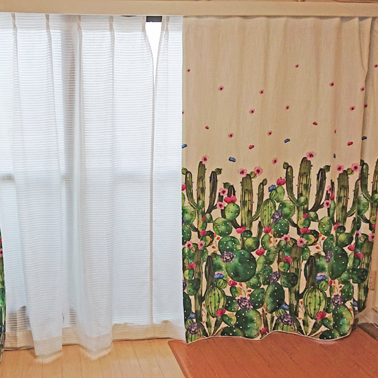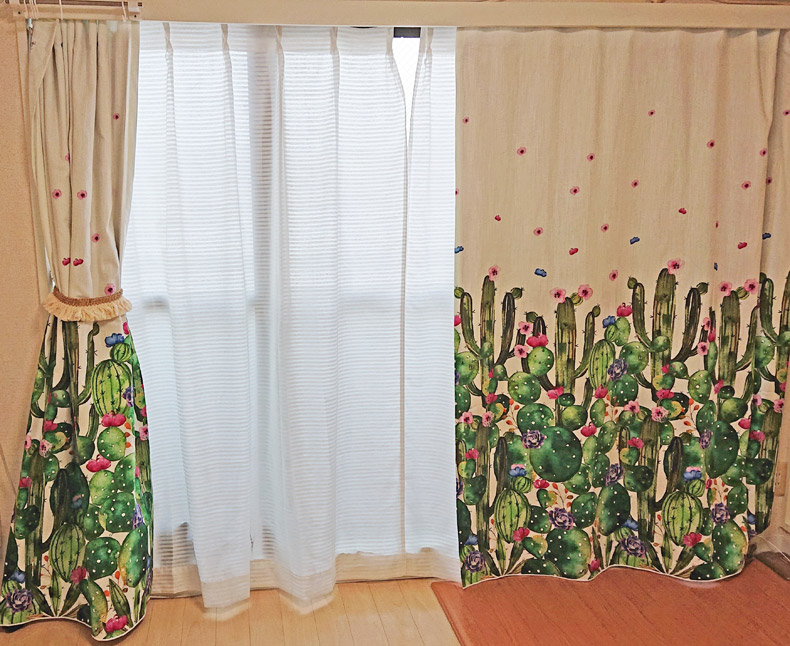 また、癒しを求めて実際に観葉植物やフェイクグリーンを置くにもお世話が必要なので、カーテンのサボテンたちにラクに癒されています笑