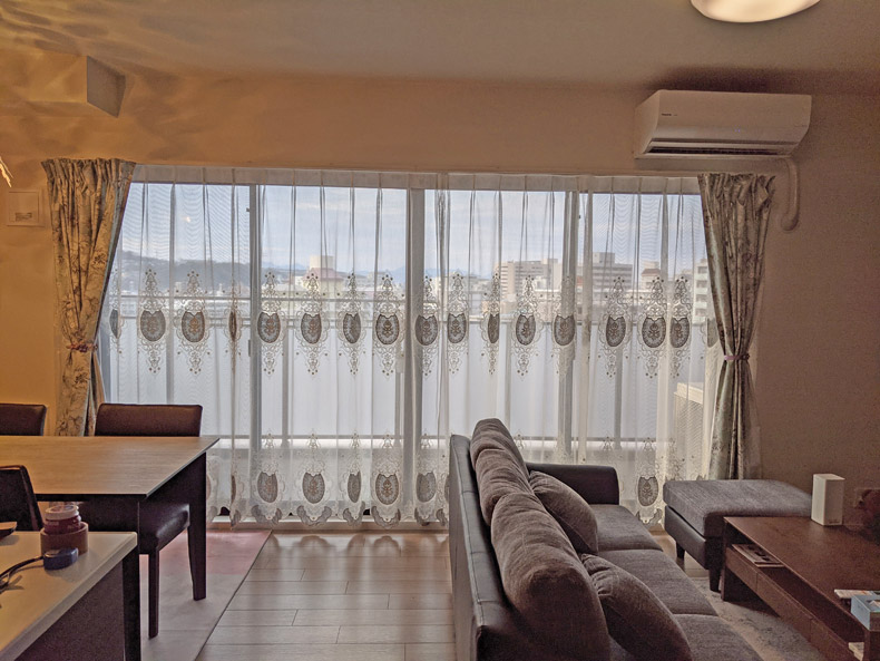また、カーテンのルーチェの色合いがソファーとマッチしているので、カーテンを閉めても圧迫感がなく、とても素敵です。