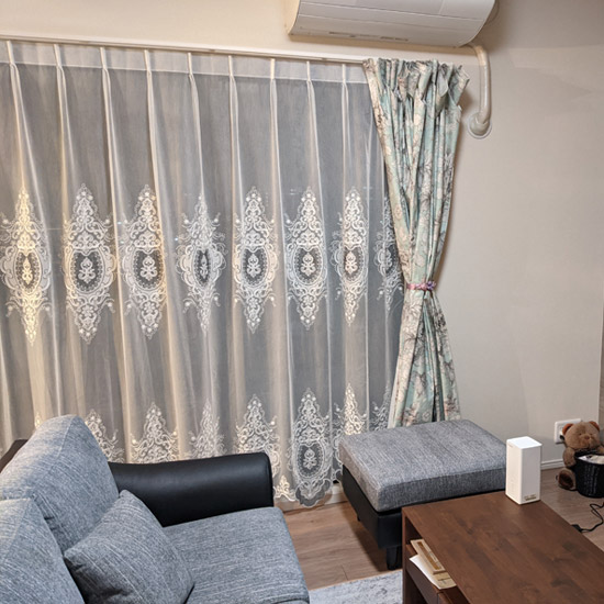 トルコレースの全体的な華やかさと裾の上品さが、ルーチェのカーテンの色合いとよく合っています。