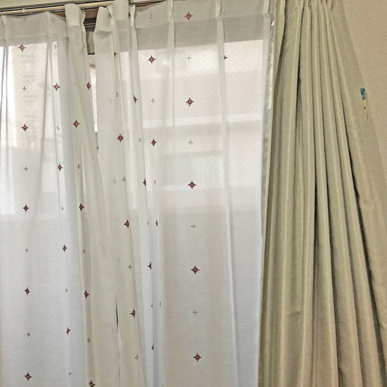 控え目なモチーフの刺繍が愛らしいレースカーテンです。
