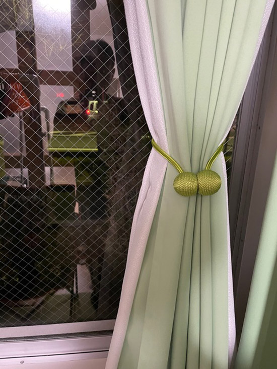 淡いカーテンのお色味と、タッセルの鮮やかなグリーンが