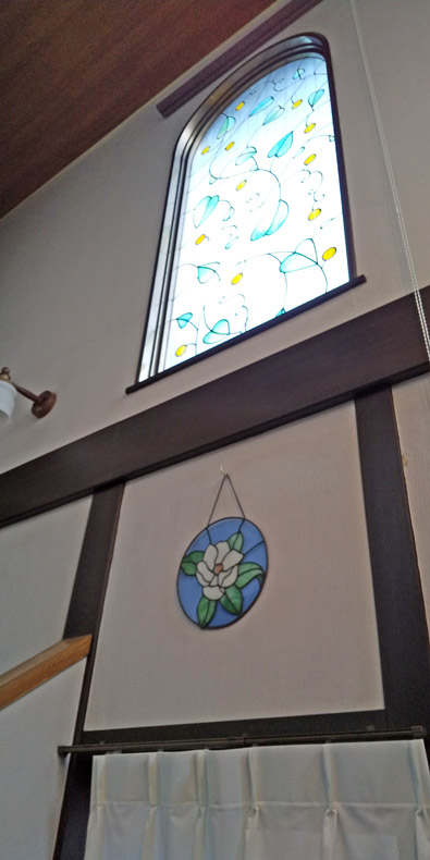 ロールスクリーンが主張し過ぎず、ステンドグラスを優しく包んでいて