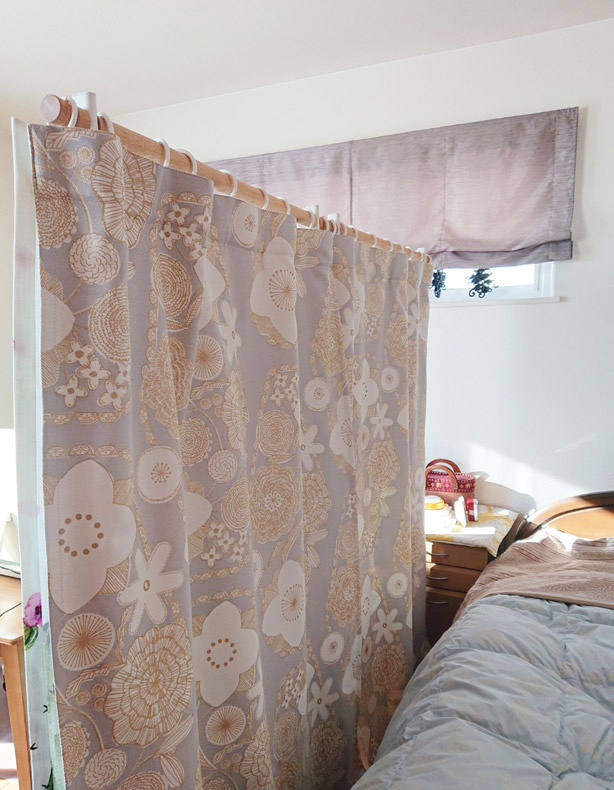 ベッドとデスクの間に置くパーテーションを探しましたがサイズもデザインもピンとくるものがなく、ハンガーラックとカーテンでオリジナルを作ることに。