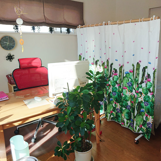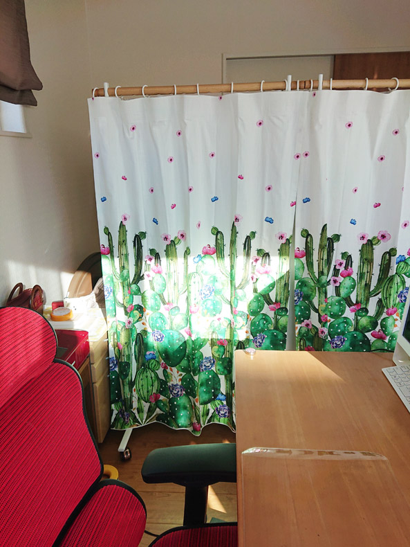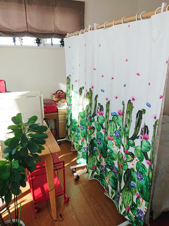 デスク側には一目惚れした美しい水彩画のサボテン柄のカーテンを掛けました。