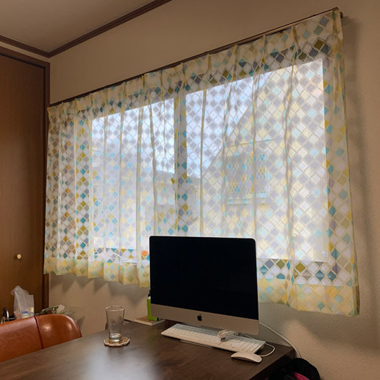 レースカーテンをお部屋側に掛けて使用する「フロントレーススタイル」なら、モザイクガラスのようなデザインの後ろに厚地カーテンのデザインが透けて見えて、