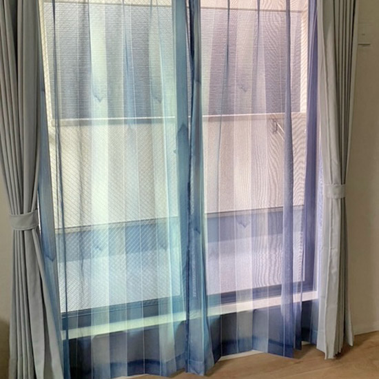 透明感のある生地のため、光の入り方によって色の見え方が変わったりするので、見るたびお楽しみいただけるカーテンです。