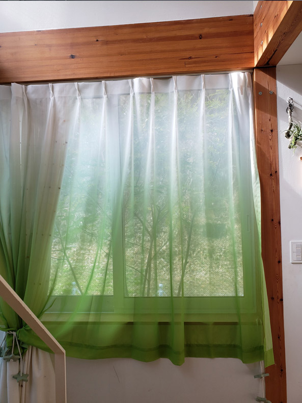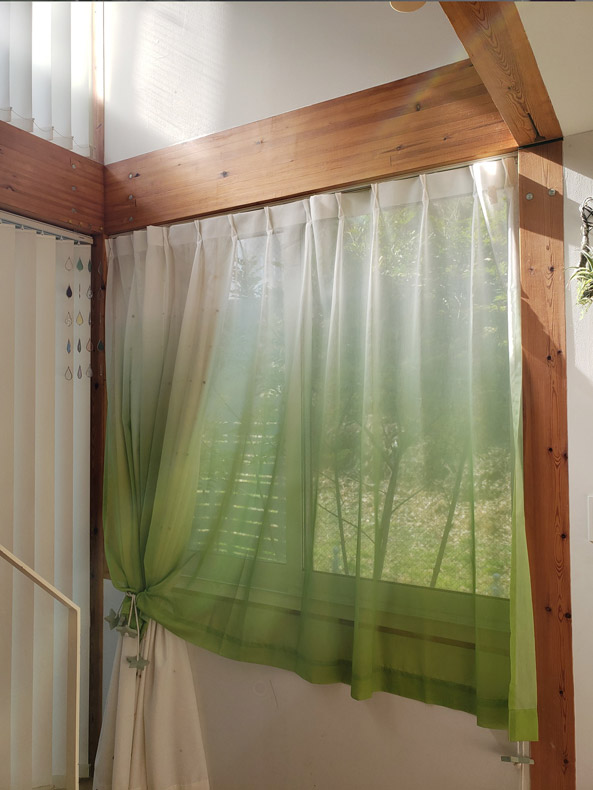 お外の植栽に合わせてとのことでグリーンの瑞々しいカラーのレースカーテンをお選びいただいております!