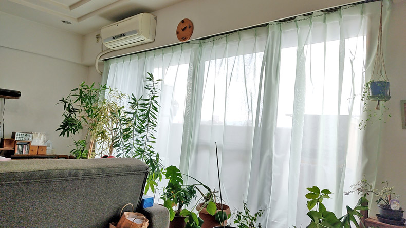 以前は、ブラウンのブラインドを付けており遮光性は抜群だったんですがホコリが付くのが気になり今回レースカーテンの購入となりました。