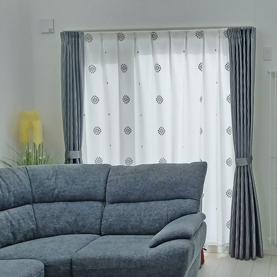 外からも内側からも見えない遮像レースカーテンで落ち着いたグレーの刺繍がとても気にいっています。