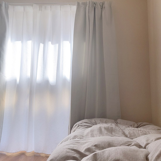 シンプルな部屋の雰囲気を邪魔せず、かつ全体を広く見せてくれるカーテンで大満足のコーディネートになりました!