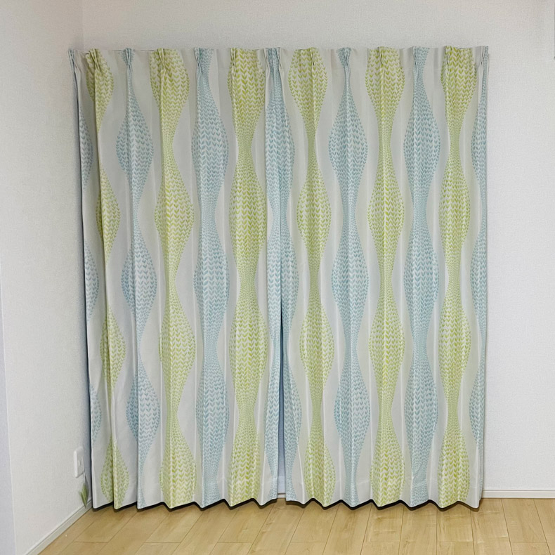 全体的に淡い色味なので派手になりすぎず、お部屋をぱっと明るくしてくれるお洒落なカーテンです(^^♪