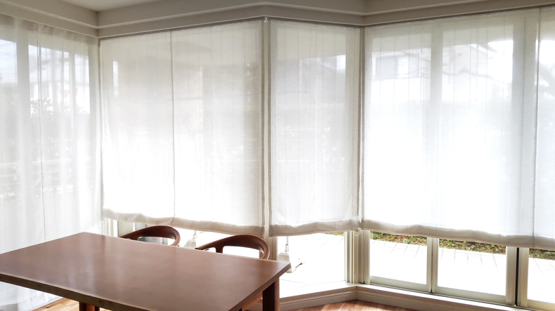 リビングは、出入りを優先で1箇所のみカーテンにしましたが、フラット加減をアドバイス頂き、ちょうどいい感じに仕上がり嬉しく思っています。