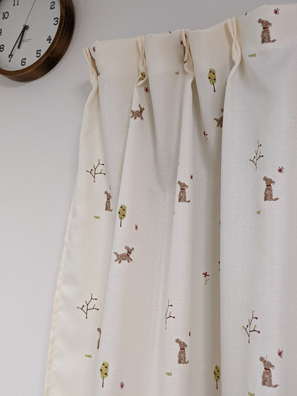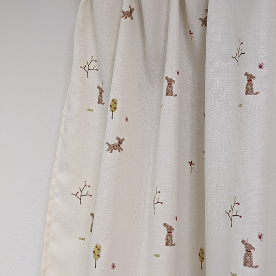ふわふわのワンちゃんの刺繍デザインがとにかく可愛いカーテンです。
