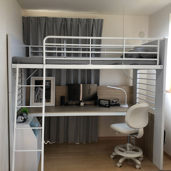 白を基調とした家具にカーテンと寝具はグレーで統一されており、