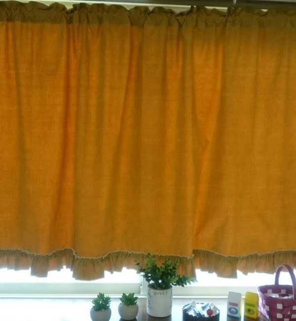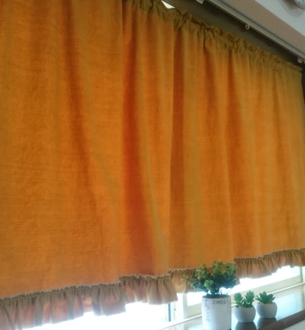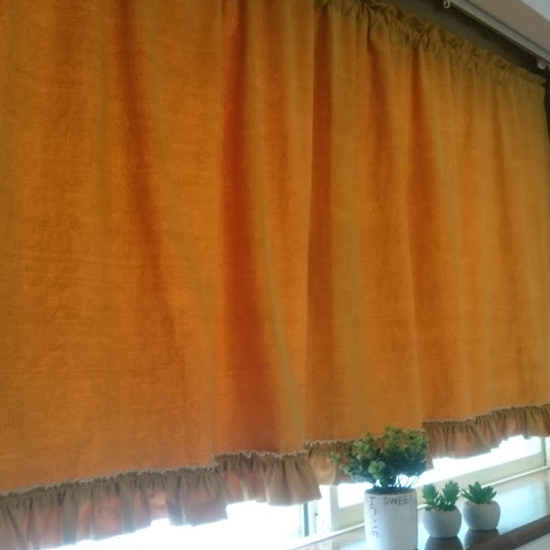 日差しが入るとオレンジの明るい色、夜はマスタード色に見える可愛いカーテンです。