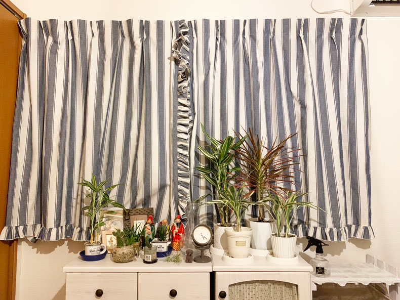 遮光ではないカーテンなので、裏側にもきれいに柄が出ていて外から見てもかわいい!自然素材だから風合いも手触りも柔らかで良いです!