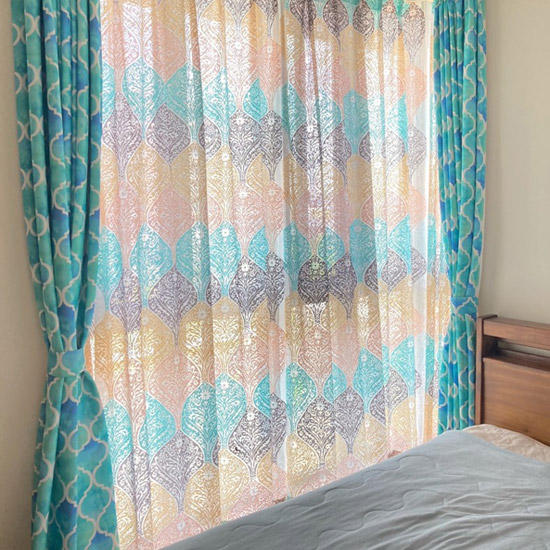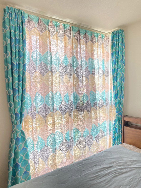 厚地カーテンとレースカーテンそれぞれにターコイズブルーが入っているので、