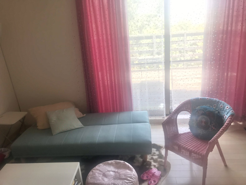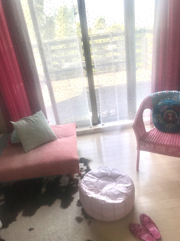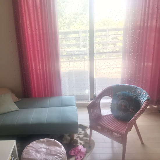ユーカラーカーテンの上にレースカーテンを掛けて