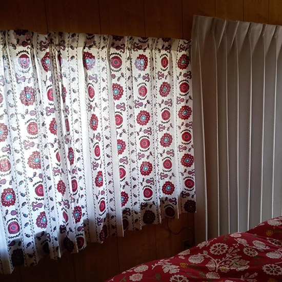 基本のカーテンは遮光の白で、アクセントにびっくりカーテンのエキゾチックな柄にしてみました。