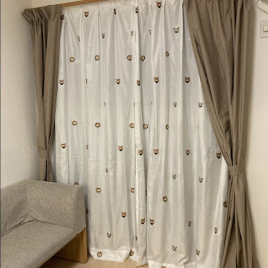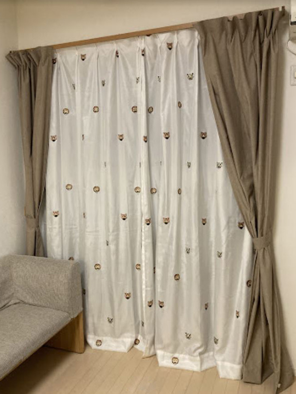 レースカーテンで過ごす時間のほうが長いので、刺繍のアニマルレースカーテンが主役のコーディネートです。