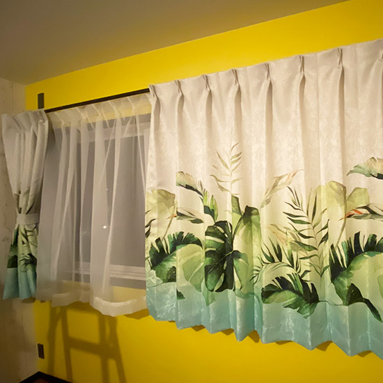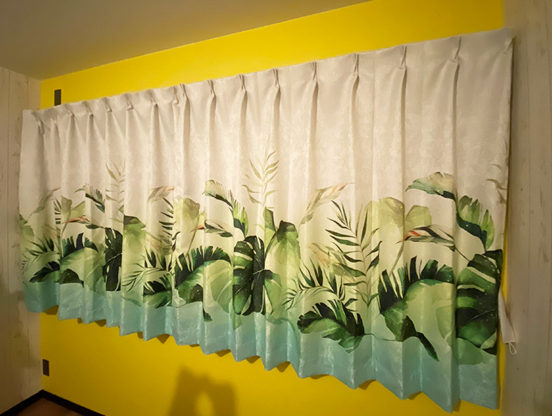 <レインフォレスト>は大胆なボタニカルデザインがインパクト大!な遮光カーテンです。
