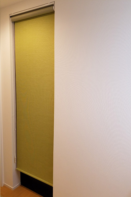 グリーン色のロールスクリーン<シャモン・ライムグリーン> 生地は後ろから降りる通常の仕様で