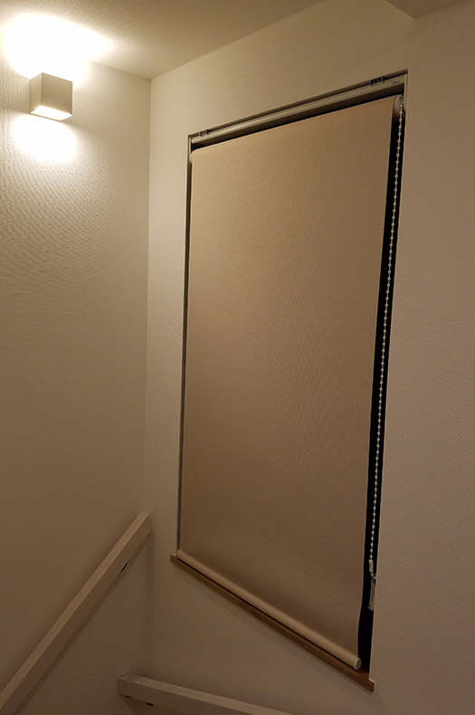 ご用意させて頂きましたが、階段のロールスクリーン<ファブリ>は窓枠内に窓を開閉するハンドルがございましたので