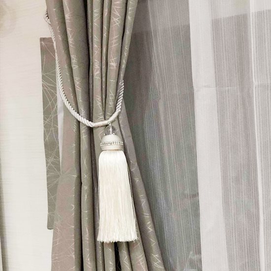 落ち着きのあるグレーのお色に白のタッセルのお色が重なって