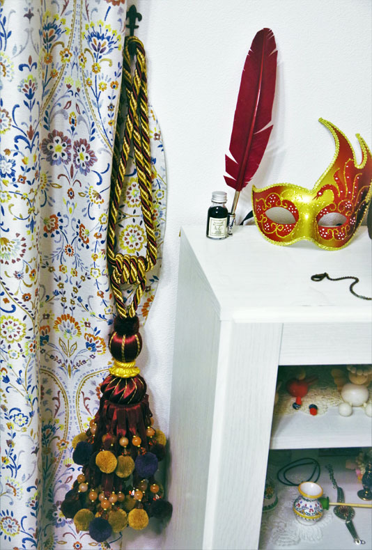 カーテンの色合いやタッセルのファンシーさにはとても魅了されました。特に写真に掲載した