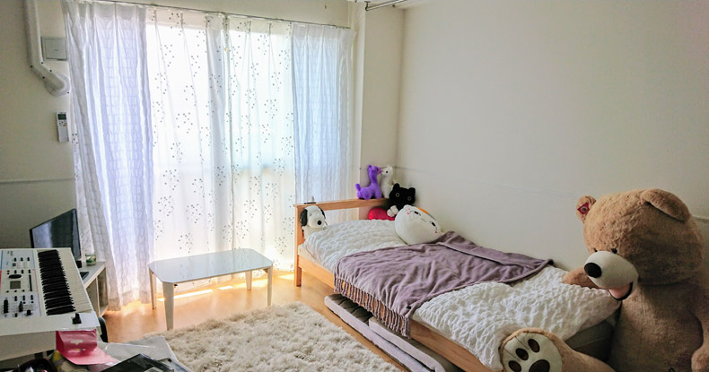 カーテンとベッドのリネンを揃えられたことで統一感があるし、ラグもフカフカで寝転がりたくなります!