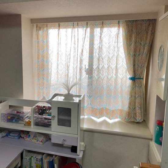 白の厚手のカーテンの上にかけると柄が出て素敵だし、昼間は光が差し込んでキラキラしてとても素敵なカーテンです!