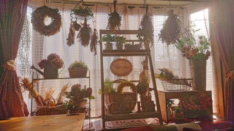 古い家の出窓をディスプレイしたくて少しずつ雑貨屋さんのお花コーナーの様に飾りつけてみました。