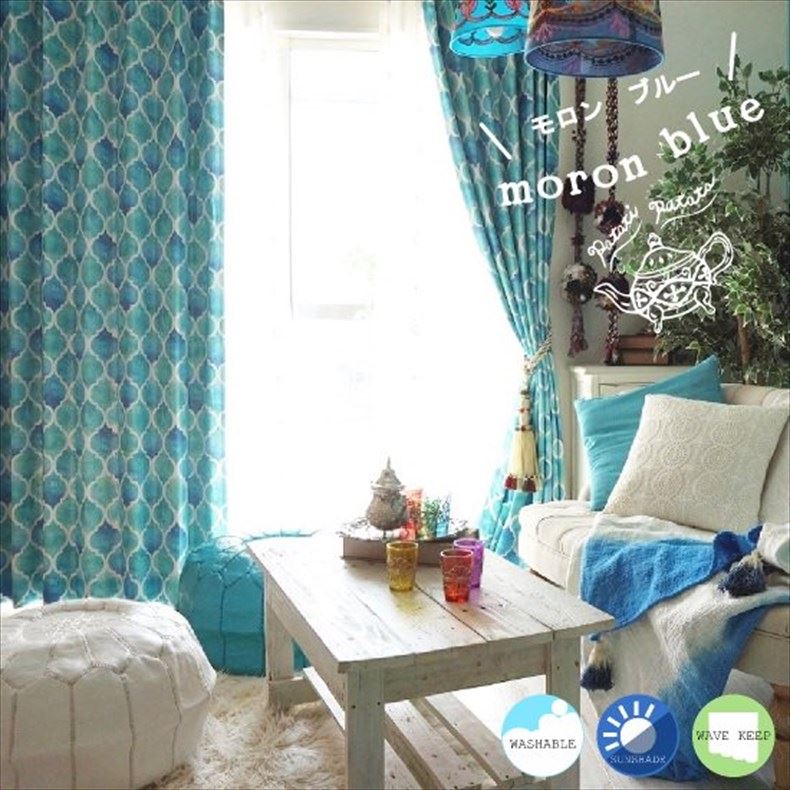 <モロン ブルー>はモロッカンタイル柄の遮光カーテン、