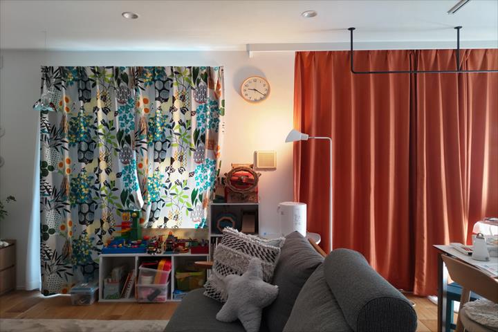なので、元々あったオレンジのカーテに合うもので元気がでる、暖か味のある雰囲気のカーテンを探しておりました。