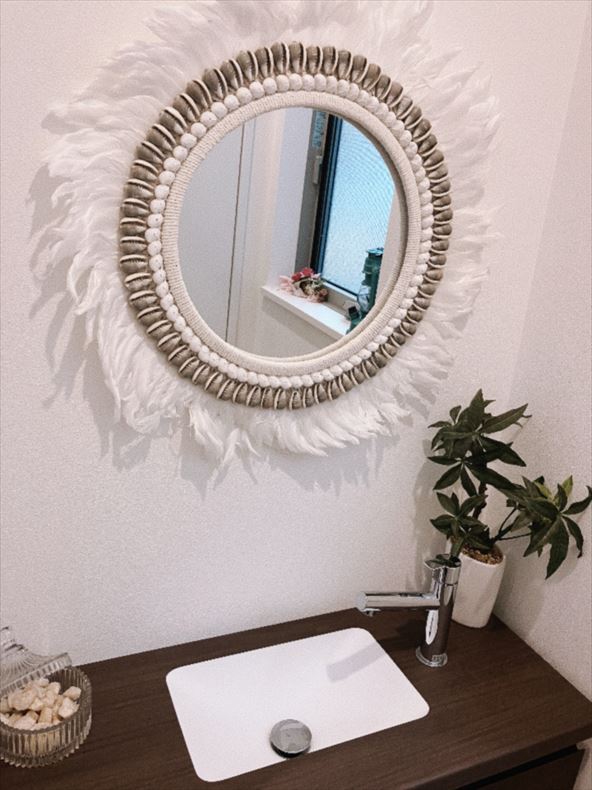 て購入しました。トイレの洗面台に設置しましたが、貝殻や羽の装飾が可愛くとても気に入っています。