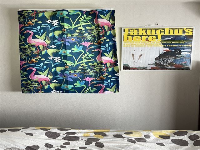 非遮光のカーテンですので、外から光がさらに描かれたフラミンゴを引き立ててくれます。