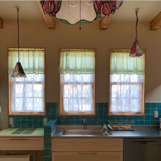 ダイニングのグリーンのカフェカーテンは、ずっと前から買っていた他所のものですが、