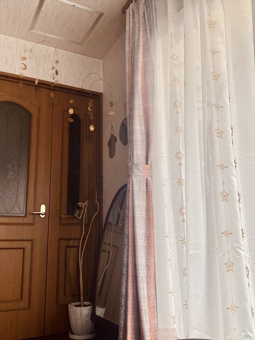 遮光カーテンの方は、壁の色味にも調和が取れており、レースカーテンの方はモビールを彷彿させる感じのデザインで気に入っております♪