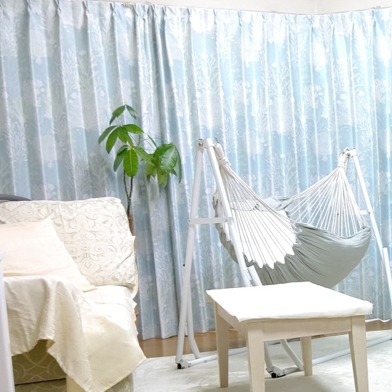 前のカーテンがくすんだピンク系だったので、部屋がとても明るくなりました。