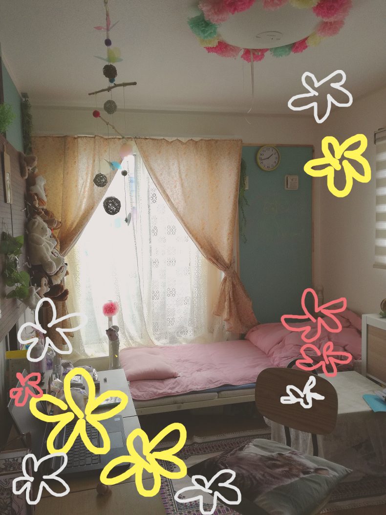 カラフルなポンポンがついた照明ブルーのアクセントクロスやピンクのベットシーツなどとってもオシャレなお部屋で思わず見入ってしましました!