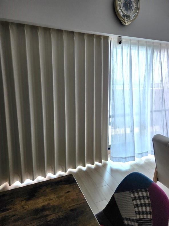 形状記憶加工が標準仕様の厚地カーテンなので、大きいお窓でも綺麗にウェーブが整って上品なお窓周りとなっておりますね!