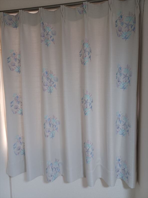 西海岸テイストが好きで、遮光カーテンは珊瑚と貝殻のグラーデーションカラーの刺繍が可愛く落ち着いた雰囲気です。レースも同じシリーズで合わせたので、遮光カーテンをあけてもしめても海を感じることができ毎日癒されています。