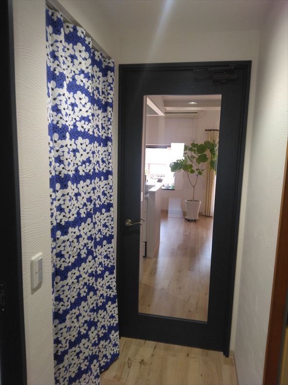 濃いブルーのカーテンが扉のお色味にあっていて素敵です( *´艸`)